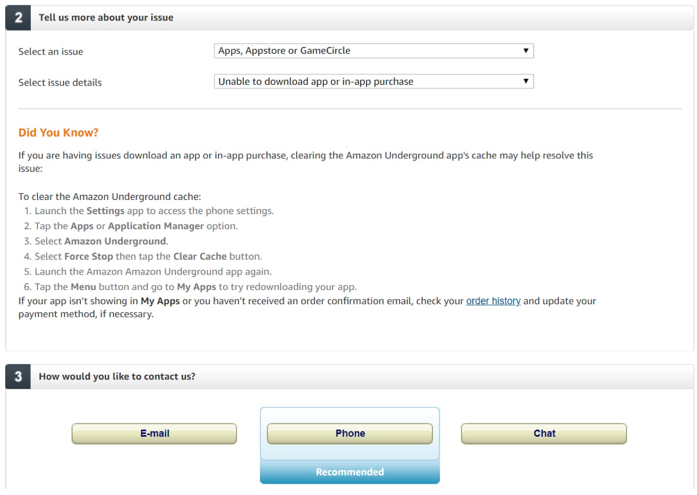 Exempel från Amazon - rekommendation på det mest effektiva sättet att få frågan löst, beroende på vad ärendet handlar om.